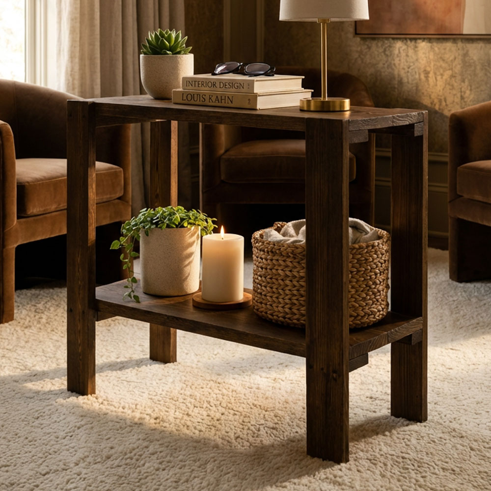 🪵 Masif Ahşap 2 Katlı Yan Sehpa – Doğal Ahşap Raflı Dekoratif Tasarım