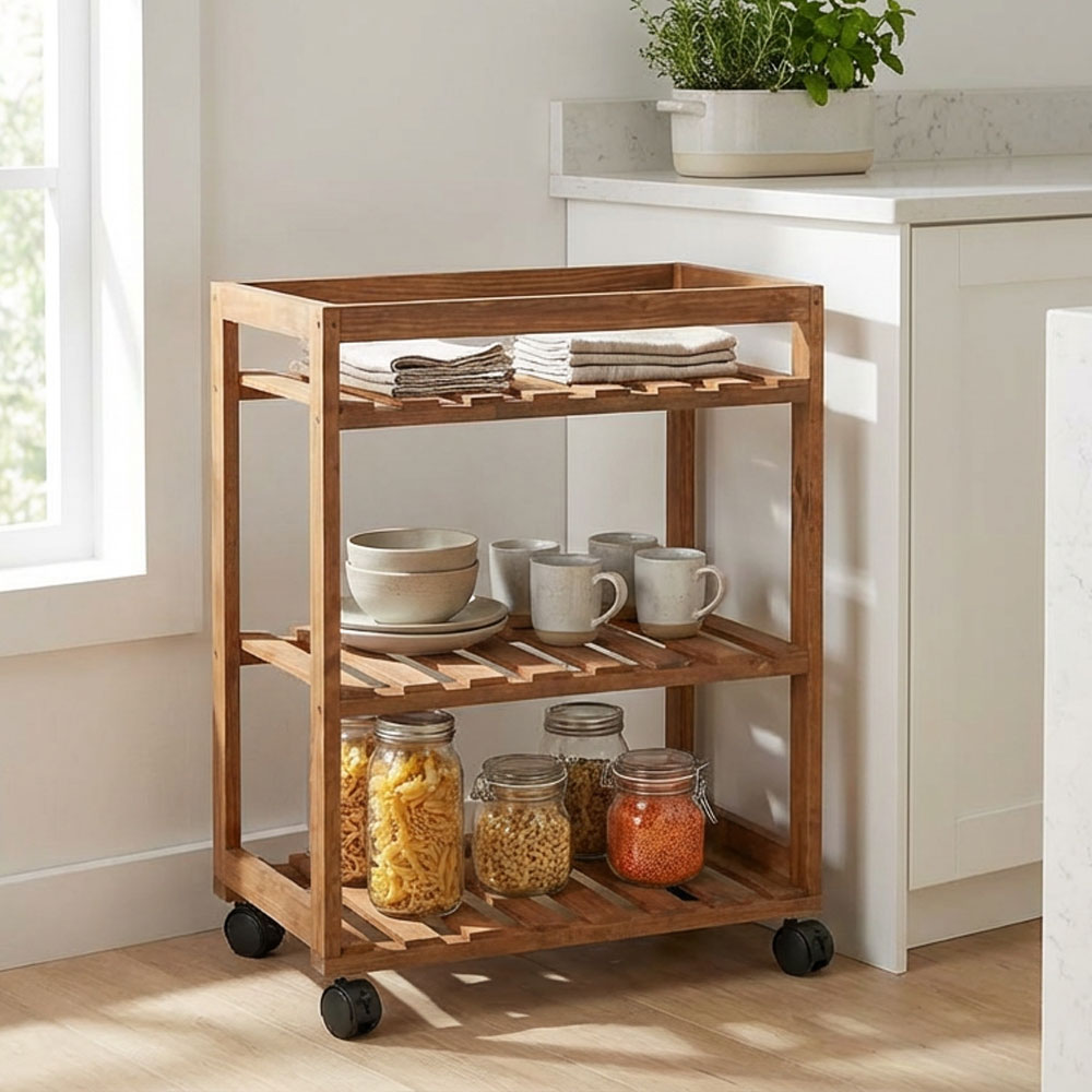 Tekerlekli Servis Arabası – Ahşap Çiçeklik ve Çok Amaçlı Mutfak Dolabı, 3 Katlı Ahşap Mutfak Rafı