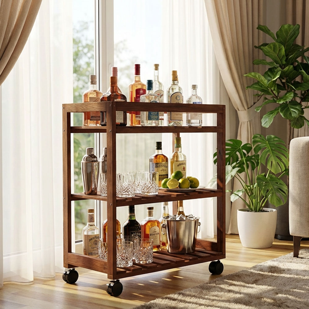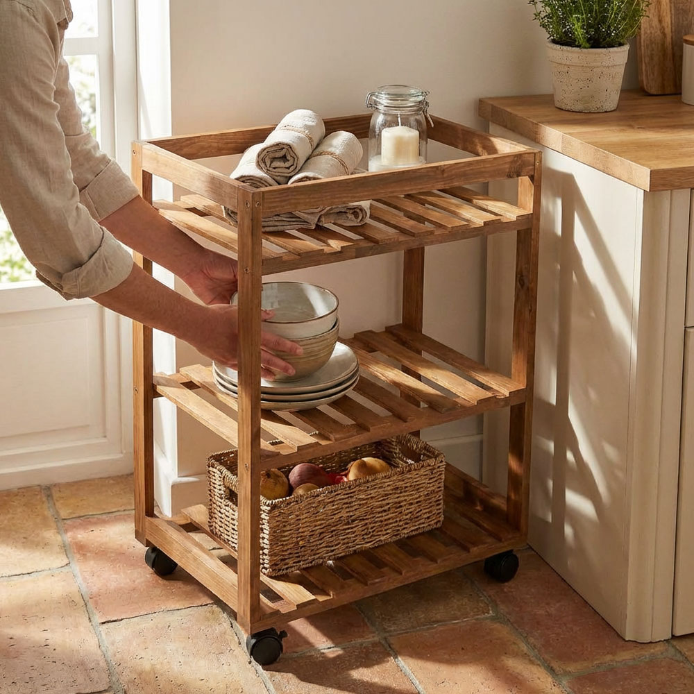 Mutfak düzenleyici raf, servis sehpası, kahve köşesi standı, balkon çiçekliği veya dekoratif ahşap raf olarak kullanılabilir.