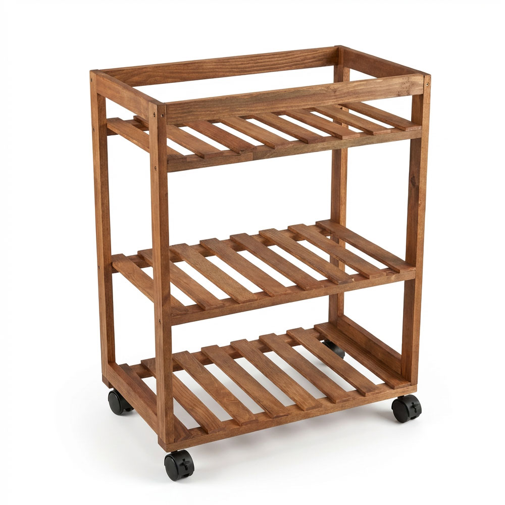 Evinizde hem şıklık hem düzen sağlayan tekerlekli servis arabası, doğal ahşabın sıcaklığı ile tasarlandı. 3 katlı yapısı sayesinde ister mutfak servis arabası, ister ahşap çiçeklik, ister çok amaçlı mutfak dolabı olarak kullanabilirsiniz.